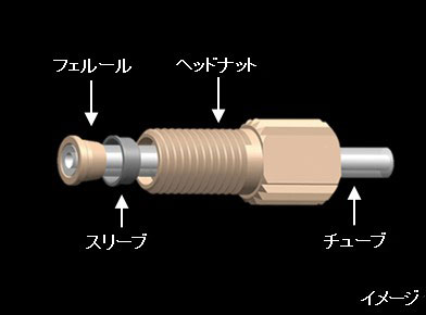 • チューブ先端にスリーブとフェルールを取り付け、ヘッドナットと共に1/4-28UNFメスネジのフラットボトムポートに接続します。