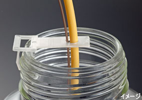 • 肉厚7mmまでの広口ボトル、ポリタンクやビーカーなどの注ぎ口に取り付け、アームから伸びたφ9.5mmの丸穴にチューブを通すホルダーです。